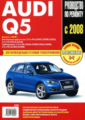 Информационно-справочное иллюстрированное издание Руководство по ремонту Audi Q5, также в книге рассмотрено устройство модели, руководство по техническому обслуживанию и эксплуатации автомобилей Audi Q5 с передним или постоянным полным приводом quattro, которые выпускаются с 2008 года, оборудованы бензиновыми двигателями рабочим объемом 2,0, 3,2 л., а также турбодизелями рабочим объемом 2,0 и 3,0 л. Установлена 6-ти ступенчатая механическая КП или 7-ми ступенчатая роботизированная DSG.