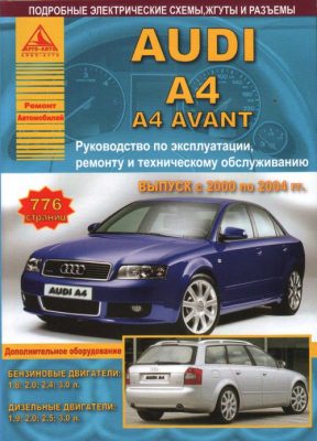 Справочное иллюстрированное издание руководство по техническому обслуживанию Ауди А4, Ауди А4 Авант, устройство Ауди А4, Ауди А4 Авант, руководство по эксплуатации и техническому обслуживанию Audi A4 / Audi A4 Avant, которые производились с 2000 по 2004 год и оборудованы бензиновыми двигателями литражом 1,8, 2,0, 2,4, 3,0, а также дизельными силовыми агрегатами рабочим объемом 1,9, 2,0, 2,5, 3,0 л. Ремонт узлов и агрегатов. Эксплуатация, техобслуживание, электрические схемы.