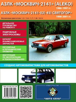 Универсальный практический мануал по ремонту Москвич Святогор, включающее инструкцию по эксплуатации, техническое обслуживание и каталог деталей автомобилей Москвич 2141-02(-45), выпущенных в период с 1986 по 1997 год и оборудованных бензиновыми двигателями рабочим объемом 1,5, 1,6, 1,7, 1,8, 2,0 л.