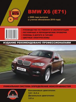 Подробное справочно-информационное с качественными иллюстрациями издание Руководство по ремонту BMW X6 в кузове E71, а также руководство по эксплуатации и техническому обслуживанию BMW X6, устройство BMW X6, производственный выпуск которых начат в 2008 году и с учетом обновлений 2010 года. Эта модель оборудуется бензиновыми двигателями рабочим объемом 3,0 и 4,4 л., а также дизелями рабочим объемом 3,0 л. Ремонт БМВ Х6. Инструкция по эксплуатации. Схемы электрооборудования.