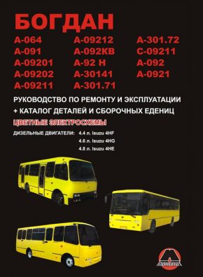 л. и 4HE рабочим объемом 4,8 л.Пособие включает в себя общие сведения об устройстве автомобилей Богдан А-064 / А-091 / А-09201 / А-09202/ А-09211 / А-09212 / А-092КВ / А-92 Н/А-30141 / А-301.71 / А-301.72 / С-09211 / А-092 / А-0921 и их модификаций, рекомендации по эксплуатации и техническому обслуживанию, описание возможных неисправностей узлов и агрегатов двигателя, трансмиссии, ходовой части, рулевого управления, тормозной системы. Советы, приведенные в издании, помогут провести ТО и сделать ремонт, как на станции технического обслуживания, так и своими силами.В отдельные разделы мануала входят инструкция по эксплуатации автобусов Bogdan и схемы электрооборудования (электросхемы) машины.Настоящая книга будет полезна владельцам и пользователям автомобилей Богдан, специалистам СТО, ремонтных мастерских и автосервисов.Мягкий переплет. 370 стр.ISBN 978-932-1672-12-6Содержание книги: