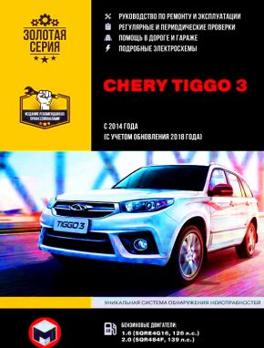 Руководство по ремонту Чери Тигго-3, книга по ремонту и эксплуатации Chery Tiggo-3, инструкция по техническому обслуживанию Чери Тигго 3 с 2014 г. выпуска (плюс рестайлинг 2018 в книге учтен), оборудованных бензиновыми двигателями SQRE4G16 и SQR484F рабочим объемом 1,6, 2,0 литра мощностью 126 и 139 л.с. Подробное справочное издание.