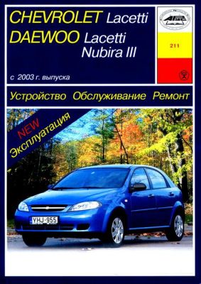 Справочное издание инструкция по ремонту Chevrolet Lacetti / Daewoo Lacetti, Daewoo Nubira III, эксплуатации и техническому обслуживанию, устройство автомобилей Chevrolet Lacetti / Daewoo Lacetti, Daewoo Nubira III с 2003 г. выпуска, оборудованных бензиновыми двигателями рабочим объемом 1,4, 1,6, 1,8 л. Ремонт Шевроле Лачетти. Эксплуатация, ТО, электрические схемы.