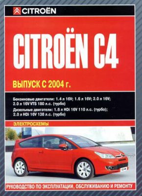 Справочно-информационная книга руководство по ремонту Citroen C4, руководство по эксплуатации и техническому обслуживанию Citroen C4, устройство Citroen C4 с 2004 г. выпуска, оборудованных бензиновыми силовыми агрегатами рабочим объемом 1,4, 1,6, 2,0 л. и дизельными двигателями рабочим объемом 1,6, 2,0 л.
