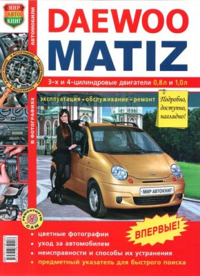 Справочно-информационное с подробными цветными иллюстрациями пособие Руководство по ремонту Деу Матиз, а также руководство по эксплуатации и техническому обслуживанию Daewoo Matiz, устройство Daewoo Matiz всех годов выпуска, оборудованных бензиновыми двигателями рабочим объемом 0,8 и 1,0 л. – F8CV (0,8 л. SOHC), B10S1 (1,0 л. SOHC).