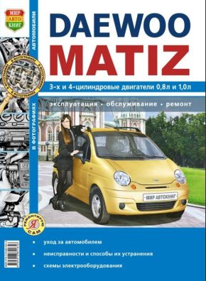Пособие по ремонту, эксплуатации и техническому обслуживанию, устройство автомобилей Daewoo Matiz с 1998 г. выпуска, а также модифицированных моделей образца 2000 года, оборудованных бензиновыми двигателями рабочим объемом 0,8 и 1,0 л. – F8CV (0,8 л. SOHC), B10S1 (1,0 л. SOHC). Устройство. Эксплуатация. ТО. Электрические схемы. Ремонт в фотографиях.