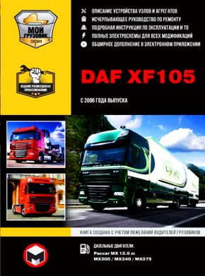 Руководство по ремонту DAF 105, а также инструкция по эксплуатации, техническому обслуживанию, устройство ДАФ ХФ105 с 2006 года выпуска, оборудованных дизельными двигателями Paccar MX 12,9 л: MX300 / MX340 / MX375.
