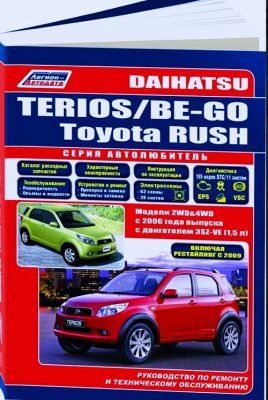 Справочно-информационное иллюстрированное издание руководство по обслуживанию Daihatsu Terios / Daihatsu Be-Go, Toyota Rush, также в книге рассмотрено устройство Дайхатсу Териос, Дайхатсу Би-Го, Тойота Раш, представлена инструкция по эксплуатации и техобслуживанию Дайхатсу Териос, Дайхатсу Би-Го, Тойота Раш, которые производятся с 2006 года. Оснащаются эти заднеприводные и полноприводные модели бензиновыми моторами 3SZ-VE рабочим объемом 1,5 л. Ремонт узлов и агрегатов. Рекомендации по эксплуатации и ТО. Схемы электрических соединений.