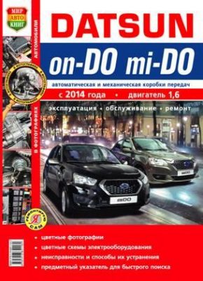 Цветная в фотографиях книга по ремонту Datsun mi-Do / on-Do, а также инструкция по техническому обслуживанию и эксплуатации автомобилей Датсун ми-До / он-До с 2014 года выпуска, оборудованных автоматическими и механическими коробками передач и двигателями рабочим объемом 1,6 л.