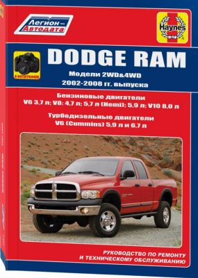 Руководство по ремонту Додж Рам, книга по ремонту Dodge Ram, инструкция по эксплуатации, пособие по техническому обслуживанию Dodge RAM 2002-2008 г. выпуска, оборудованных бензиновыми двигателями рабочим объемом V6 3,7 л, V8 4,7 л, 5,9 л, Hemi 5,7 л, V10 8,0 л, а также турбодизельными двигателями V6 Cummins рабочим объемом 5,9 л и рабочим объемом 6,7 литра.