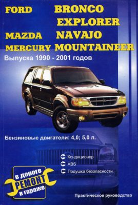 Справочно-информационная книга руководство по ремонту Ford Bronco, руководство по техническому обслуживанию Ford Bronco, Ford Explorer, Mazda Navajo, Mercury Mountaneer 1990-2001 гг. выпуска, оборудованных бензиновыми двигателями рабочим объемом 4,0, 5,0 л.