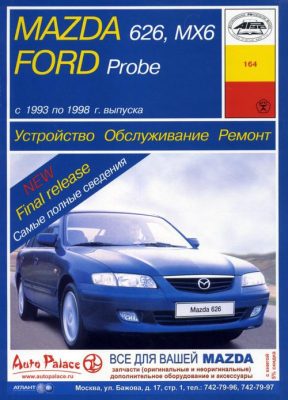 Справочное издание Руководство по ремонту Ford Probe, Mazda MX-6, Mazda 626, а также руководство по эксплуатации и техническому обслуживанию, устройство автомобилей Ford Probe, Mazda MX-6, Mazda 626 1993-1998 гг. выпуска, с кузовами Седан, Хэтчбек и Купе, оборудованных рядными 4-цилиндровыми и V6 бензиновыми двигателями рабочим объемом 2,0 и 2,5 л., оснащенных 5-ступенчатой РКПП, либо 4-ступенчатой АТ.