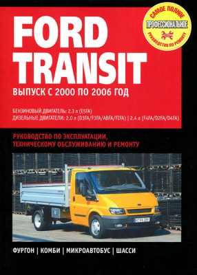 Справочное иллюстрированное издание Пособие по обслуживанию Форд Транзит, руководство по эксплуатации и ремонтным операциям, устройство автомашин Ford Transit (тип FD) в кузове комби, фургон, микроавтобус, шасси с одинарной и двойной кабиной, которые выпускались в Бельгии и Турции с 2000 по 2006 год, оборудованы бензиновыми двигателями литражом 2,3, а также дизелями литражом 2,0 и 2,4.