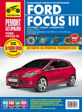 Справочное, со множеством цветных иллюстраций пособие руководство по ремонту Ford Focus 3, а также руководство по эксплуатации и техническому обслуживанию Ford Focus 3, устройство Ford Focus 3 с 2011 г. выпуска, оборудованных бензиновыми двигателями рабочим объемом 1,6 (105 и 125 л.с.) и 2,0 л. (150 л.с.). Рассмотрены все варианты кузова. Ремонт Форд Фокус-3. Цветные фотографии. Схемы электрооборудования. Инструкция по эксплуатации.
