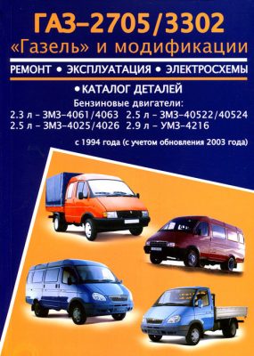 Иллюстрированное справочное издание Инструкция по ремонту ГАЗ 2705-3302 Газель, устройство, руководство по техническому обслуживанию и эксплуатации автомобилей ГАЗ 33021-2705 Газель с 1994 года выпуска и рестайлинговых моделей с 2003 г. выпуска, оборудованных бензиновыми двигателями ЗМЗ-4061 / 4063 (2,3 л.), ЗМЗ-4025 / 4026 (2,5 л.), ЗМЗ-40522 / 40524 (2,5 л., Евро 2), УМЗ-4216 (2,9 л.). Также в сборник включен каталог запчастей ГАЗ 2705-3302 Газель, каталог деталей и сборочных единиц ГАЗ 2705-3302 Газель.