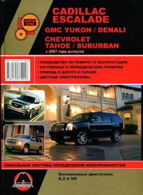 Информационно-справочное иллюстрированное пособие Руководство по ремонту GMC Denali / GMC Yukon / Cadillac Escalade / Chevrolet Tahoe / Chevrolet Suburban, а также устройство этих моделей, руководство по эксплуатации и операциям связанным с техническим обслуживанием GMC Denali / GMC Yukon / Cadillac Escalade / Chevrolet Tahoe / Chevrolet Suburban. Эти машины выпускаются с 2007 года и оборудуются бензиновыми двигателями рабочим объемом 6,2 л. V8.