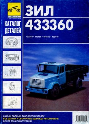 Полный заводской каталог деталей ЗИЛ 433360, 442160, 494560, 433110, каталог запасных частей и сборочных единиц автомобилей ЗИЛ 433360, 442160, 494560, 433110. В издании указаны обозначения запчастей и деталей, их наименование, количество на автомобиль ЗИЛ 433360 или вариант его комплектации.
