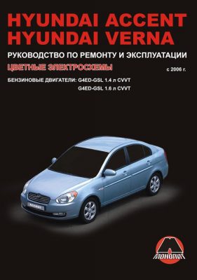 Справочное издание Руководство по ремонту Hyundai Verna / Hyundai Accent, а также руководство по эксплуатации и техническому обслуживанию, устройство автомобилей Hyundai Verna / Hyundai Accent с 2006 г. выпуска, оборудованных бензиновыми двигателями G4ED-GSL рабочим объемом 1,4 л., G4ED-GSL рабочим объемом 1,6 л. Ремонт Хюндай Верна. Рекомендации по эксплуатации и обслуживанию. Электросхемы.
