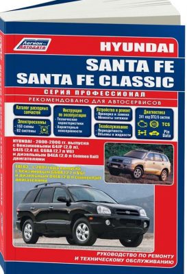 Иллюстрированное справочно-информационное подробное издание инструкция по ремонту Hyundai Santa Fe / Hyundai Santa Fe Classic, а также руководство по эксплуатации и техническому обслуживанию Hyundai Santa Fe, детально рассмотренное устройство Hyundai Santa Fe 2000-2006 годов выпуска. Этот внедорожник оборудуется бензиновыми двигателями G4JP, G4JS, G6BA рабочим объемом 2,0, 2,4 и 2,7 л. соответственно, а также дизельным агрегатом D4EA рабочим объемом 2,0 л. (Common Rail). Ремонт узлов и агрегатов. Каталог расходных запчастей. Эксплуатация, устройство, ТО. Диагностика. Схемы электрических соединений Хендай СантаФе.