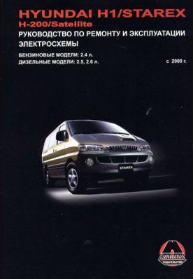 Руководство по ремонту, эксплуатации и техническому обслуживанию автомобилей Hyundai Starex, книга по ремонту Хендай Старекс с 2000 г. выпуска, оборудованных бензиновыми двигателями рабочим объемом 2,4 л. и дизельными двигателями рабочим объемом 2,5, 2,6 л. Ремонт Хендай Старекс. Инструкция по эксплуатации. Электрические схемы.