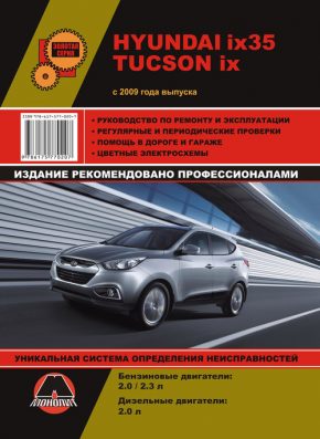 Подробнейшее информационно-справочное пособие с иллюстрациями Инструкция по ремонту Hyundai Tucson ix / Hyundai ix35, а также руководство по эксплуатации и техническому обслуживанию, устройство Hyundai Tucson ix / Hyundai ix35 с 2009 года выпуска. Модели оборудуются бензиновыми двигателями рабочим объемом 2,0 и 2,3 л., а также дизельными агрегатами рабочим объемом 2,0 л. Ремонт Хендай Туксон. Эксплуатация. Техобслуживание. Помощь в дороге и гараже. Схемы электрических соединений.