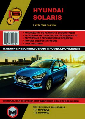 Книга по ремонту Хендай Солярис, руководство по ремонту и эксплуатации, инструкция по техническому обслуживанию Hyundai Solaris с 2017 г. выпуска, оборудованных бензиновыми двигателями G4LC (1.4 л) и G4FG (1.6 л) в разных комплектациях.