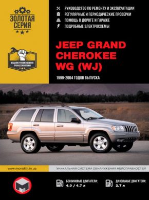 Справочно-информационное иллюстрированное издание руководство по ремонту Джип Гранд Чероки, а также устройство, руководство по эксплуатации и техническому обслуживанию Jeep Grand Cherokee WG (WJ). Модели выпускались с 1999 по 2004 года и оборудовались бензиновыми двигателями рабочим объемом 4,0 и 4,7 л. и дизельными двигателями рабочим объемом 2,7 л.