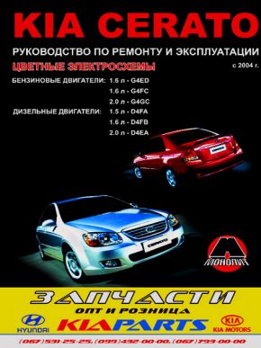 Издание информационно-справочное Руководство по ремонту Киа Церато, а также руководство по эксплуатации и техническому обслуживанию, устройство автомобилей Kia Cerato с 2004 г. выпуска, оборудованных бензиновыми двигателями G4ED, G4FC рабочим объемом 1,6 л., G4GC рабочим объемом 2,0 л., а также дизельными двигателями D4FA рабочим объемом 1,5 л., D4FB рабочим объемом 1,6 л., D4EA рабочим объемом 2,0 л. Ремонт Киа Церато. Эксплуатация, обслуживание, схемы электрических соединений.