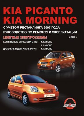 Иллюстрированное информационно-справочное пособие по ремонту Kia Picanto, а также руководство по эксплуатации и техническому обслуживанию, устройство Kia Picanto с 2003 г. выпуска, оборудованных бензиновыми двигателями G4HG рабочим объемом 1,0, 1,1 л., а также дизельными двигателями D3FA5 рабочим объемом 1,1 л. Ремонт узлов и агрегатов. Устройство, техобслуживание, экслпуатация, схемы электрооборудования.