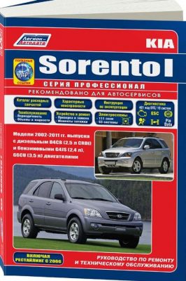 Пособие по ремонту Kia Sorento, руководство по ремонту, эксплуатации и техническому обслуживанию, устройство полноприводных автомобилей Kia Sorento с 2002 года выпуска, а также рестайлинговых моделей с 2006 г. выпуска, оборудованных бензиновыми двигателями G4JS (2,4 л.) и G6CU (3,5 л.), а также дизельными двигателями D4CB (2,5 л. CRDi (VGT и WGT)). Ремонт узлов и агрегатов. Каталог расходнников Киа Соренто.. Экслуатация и ТО. Электрические схемы.