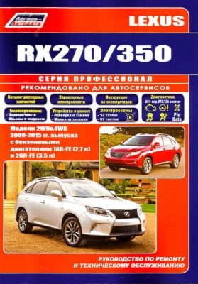 Книга по ремонту Лексус RX350 / 270, а также руководство по эксплуатации и техобслуживанию Лексус РХ350 / 270 моделей 2WD&4WD, выпускавшихся с 2009 года и оборудованных бензиновыми двигателями 1AR-FE рабочим объемом 2,7 л и 2GR-FE рабочим объемом 3,5 л. Ремонт узлов и агрегатов. Устройство, эксплуатация, ТО, диагностика. Электрические схемы. Каталог расходных запчастей.