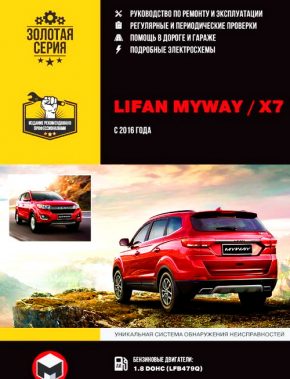 Руководство по ремонту Lifan MyWay с 2016 г. выпуска, оборудованных бензиновыми двигателями LFB479Q рабочим объемом 1,8 литра, автоматической и механической коробкой передач. Инструкция по эксплуатации Лифан Майвей. Рекомендации по техобслуживанию. Ремонт узлов и агрегатов. Уникальная система определения неисправностей. Электросхемы.