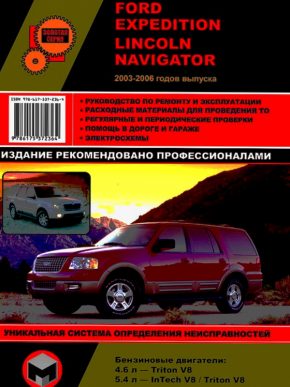 Руководство по ремонту Lincoln Navigator, книга по обслуживанию, инструкция по эксплуатации Линкольн Навигатор 2003-2006 г. выпуска, оборудованных бензиновыми двигателями Triton V8 объемом в 4,6 л и 5,4 – литрового InTech V8/ Triton V8. Ремонт Линкольн Навигатор. Система определения неисправностей. Эксплуатация. ТО. Схемы электрических соединений. Помощь в дороге и гараже.
