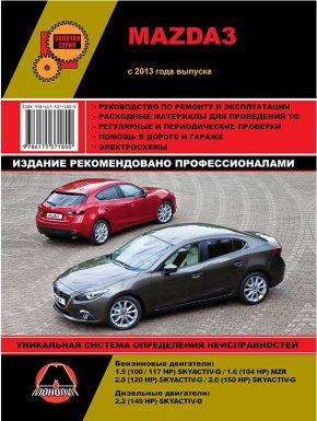 Профессиональная иллюстрированное пособие по ремонту Мазда 3, а также инструкция по техническому обслуживанию и эксплуатации автомобилей Mazda 3 с 2013 года выпуска, оборудованных бензиновыми двигателями Skyactiv-G (1,5 л. (100 / 117 НР)/ 2,0 л. (120 НР) / 2,0 л. (150 НР)) и MZR (1,6 л. (104 НР)), а также дизельными двигателями Skyactiv-D (2,2 л. (149 НР)). Ремонт узлов и агрегатов Мазда 3. Устройство, эксплуатация, рекомендации по ТО. Помощь в дороге и гараже. Система определения неисправностей. Схемы электрических соединений.