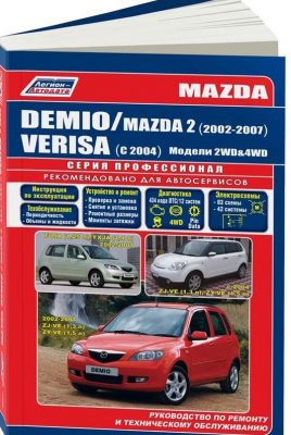 Иллюстрированное справочное пособие Руководство по ремонту Mazda Verisa, а также руководство по эксплуатации и техническому обслуживанию, устройство переднеприводных и полноприводных автомобилей Mazda Demio 2002-2007 гг. выпуска, Mazda Verisa с 2004 г. выпуска, оборудованных бензиновыми двигателями ZJ-VE (1,3 л), ZY-VE (1,5 л), а также переднеприводных Mazda 2 2002-2007 гг. выпуска, оснащенных бензиновыми двигателями FUJA (1,25 л), FXJA (1,4 л). Ремонт Мазда Вериса. Инструкция по эксплуатации. Рекомендации по ТО. Устройство автомобиля. Диагностика неисправностей. Электрические схемы.