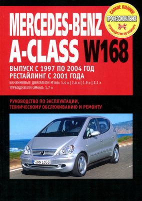 Справочное иллюстрированное издание Пособие по ремонту Мерседес А класса, устройство, руководство по эксплуатации и техническому обслуживанию Mercedes Benz A-Class W168 в кузове хетчбек, которые выпускались с 1997 по 2004 год с рестайлингом в 2001 году. Оснащались модели 4-х цилиндровыми рядными бензиновыми двигателями литражом 1,4 8V (модель А140, 82 л.с.), 1,6 8V (модель А160, 102 л.с.), 1,9 8V (модель А190, 125 л.с.), 2,1 8V (модель А210, 140 л.с.), а также 4-х цилиндровым рядным турбодизелем CDI серии 0М668 с непосредственным впрыском Common Rail литражом 1,7 16V (модели А160 CDI, 60 или 75 л.с. и А170 CDI, 90 или 95 л.с.). Оборудовались машины 5-ти ступенчатой МКП или 5-ти ступенчатой АКП.