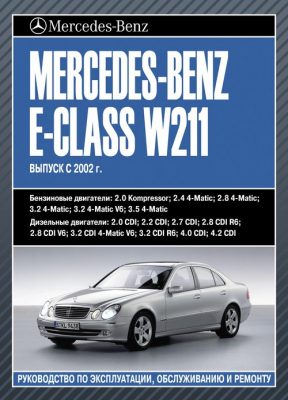 Иллюстрированное справочно-информационное издание руководство по ремонту Mercedes E-класса (кузов W211), а также руководство по эксплуатации и техническому обслуживанию, устройство Mercedes Benz E-класса, выпускаемых с марта 2002 г. (седан) и с марта 2003 г. (универсал), оснащенных бензиновыми моторами объемом 2,0 л. (Kompressor), 2,4 л. (4-Matic), 2,8 л. (4-Matic), 3,2 л. (4-Matic), 3,2 л. (4-Matic V6), а также турбодизельными моторами объемом 2,0 л. (CDI), 2,2 л. (CDI), 2,7 л. (CDI), 2,8 л. (CDI R6), 2,8 л (CDI V6), 3,5 л. (4-Matic). На машины установлены либо АКПП либо МКПП.