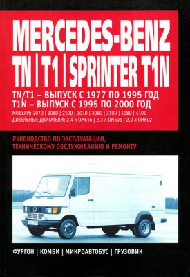 Справочное иллюстрированное издание Руководство по ремонту Mercedes-Benz TN / T1, Mercedes-Benz Sprinter T1N, устройство, руководство по эксплуатации и техническому обслуживанию Mercedes-Benz TN / T1 (тип 601 / 602, с 1977 по 1995 года выпуска), Mercedes-Benz Sprinter T1N (индекс 901 / 902, с 1995 по 2000 года выпуска) с задним приводом, в кузове комби, фургон, микроавтобус и грузовик, оборудованных дизелями литражом 2,3, 2,4, 2,9.