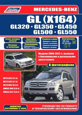 Профессиональное, в фотографиях, руководство по ремонту Mercedes GL X164, GL320, GL350, GL450, GL500, GL550, а также инструкция по эксплуатации и техническому обслуживанию автомобилей Мерседес (X164) моделей: GL320, GL350, GL450, GL500, GL550, выпускавшихся в период с 2006 по 2012 г (включая данные о рестайлинге 2009), оборудованных бензиновыми двигателями и дизельными двигателями рабочим объемом 3,0, 4,7, 5,5 л. Пособие содержит подробную информацию об автомобилях, оборудованных двигателями M273.923 (4,7 л), M273.943 (4,7 л), M273.963 (5,5 л), OM642.940 (3,0 л), OM642.822 (3,0 л). Ремонт Мерседес Х164. Каталог расходных запчастей. Устройство, ТО, эксплутация. Диагностика неисправностей. Электрические схемы.