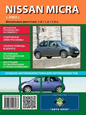 Универсальное подробное руководство по ремонту Ниссан Микра, инструкция по эксплуатации и техническому обслуживанию автомобилей Nissan Micra с 2003 года выпуска, оборудованных бензиновыми двигателями рабочим объемом 1,0, 1,2, 1,4 л. Ремонт Ниссан Микра. Эксплуатация и ТО. Электросхемы. Справочное издание.