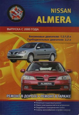 Руководство по ремонту, эксплуатации и техническому обслуживанию автомобилей Nissan Almera с 2000 года выпуска, оборудованных бензиновыми двигателями рабочим объемом 1,5, 1,8 л. и турбодизельными двигателями рабочим объемом 2,2 л. Пособие по ремонту Nissan Almera.