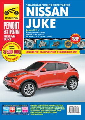 Справочное пособие с уникальными цветными иллюстрациями руководство по ремонту Nissan Juke, а также руководство по эксплуатации Nissan Juke и пособие по техническому обслуживанию Nissan Juke, устройство Ниссан Жук с 2010 г. выпуска, оборудованных бензиновыми моторами HR16DE (117 л.с.) и турбированным MR16DDT (190 л.с.) рабочим объемом 1,6 л. Пошаговый ремонт в цветных фотографиях. Эксплуатация, ТО, электрические схемы.