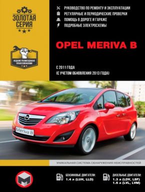 Руководство по ремонту Opel Meriva B, инструкция по эксплуатации Опель Мерива В, книга по обслуживанию автомобилей Opel Meriva B с 2011 г. выпуска и рестайлинговых моделей с 2013 г. выпуска, оборудованных бензиновыми двигателями LUN, LLD рабочим объемом 1,4 литра и дизельными двигателями LDV, LSF, LVL, LVM рабочим объемом 1,3 и 1,6 литра. Подробная информация по ремонту. Обслуживание. Эксплуатация. Электросхемы Опель Мерива В.