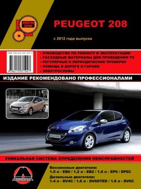 Иллюстрированная книга по ремонту Peugeot 208, а также инструкция по техническому обслуживанию и эксплуатации автомобилей Пежо 208 с 2012 года выпуска, оборудованных бензиновыми двигателями EB0 (1 л.), EB2 (1,2 л.), EP6 (1,6 л.), EP6C (1,6 л.), а также дизельными двигателями DV4C (1,4 л.), DV6DTED (1,6 л.), DV6C (1,6 л.). Мощность: 68 / 68D / 82 / 92D / 115D / 120 / 155 л. с. Ремонт Пежо 208. Инструкция по эксплуатации. Рекомендации по ТО. Схемы электрооборудования.