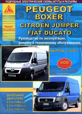Справочное иллюстрированное издание Книга по ремонту Пежо Боксер, Ситроен Джампер, Фиат Дукато, а также руководство по эксплуатации и техническому обслуживанию, устройство Пежо Боксер, Ситроен Джампер, Фиат Дукато, которые производятся с 2006 года и оборудуются дизельными двигателями рабочим объемом 2,2 и 3,0 л. Ремонт узлов и агрегатов Пежо Боксер, эксплуатация, обслуживание, электрические схемы.