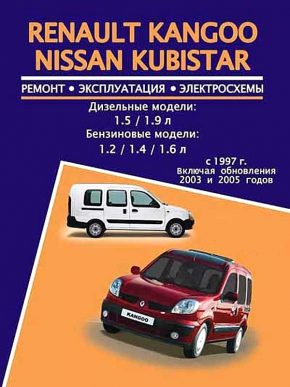 Справочное иллюстрированное издание Руководство по ремонту Рено Кангу, Ниссан Кубистар, устройство, руководство по эксплуатации и техническому обслуживанию Renault Kangoo / Nissan Kubistar, которые выпускались с 1997 по 2008 годы. Также рассмотрены обновленные модели 2003 и 2005 годов. Минивены оборудованы бензиновыми двигателями литражом 1,2, 1,4, 1,6, а также дизелями литражом 1,5 и 1,9. Ремонт Рено Кангу.