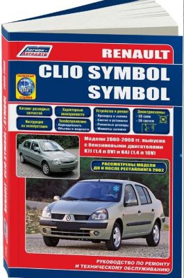 Руководство по ремонту, эксплуатации и техническому обслуживанию автомобиля Renault Clio Symbol с 2000 г. выпуска (до и после рестайлинга), оборудованных двигателями K7J (1,4 л., 8 клапанов) и K4J (1,4 л., 16 клапанов). Ремонт Рено Симбол. Эксплуатация, ТО, устройство. Каталог расходных запчастей. Неисправности. Электрические схемы.
