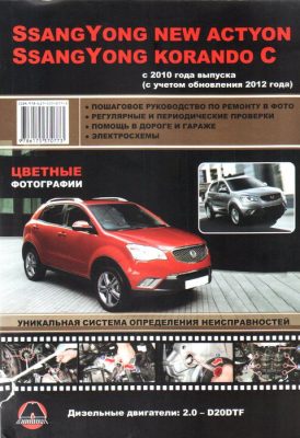 Цветное справочно-информационное иллюстрированное подробное издание руководство по ремонту SsangYong Korando C / SsangYong New Actyon, а также устройство SsangYong Korando C / SsangYong New Actyon, руководство по эксплуатации и техническому обслуживанию SsangYong Korando C / SsangYong New Actyon, которые сходят с конвейера с 2010 года и оборудуются дизельными двигателями D20DTF рабочим объемом 2,0 л. и мощностью 175 л.с.
