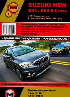 Книга по ремонту Suzuki New SX4, руководство по эксплуатации и обслуживанию Сузуки Нью СХ-4 с 2013 г. выпуска (в книге отображен рестайлинг 2016 г.), оборудованных бензиновыми двигателями K14C, M16A, рабочим объемом 1,4 И 1,6 литра.