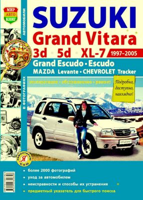 Пособие по ремонту Сузуки Гранд Витара, ремонт в фотографиях Suzuki Grand Vitara 1997-2005 г. выпуска. Бензиновые двигатели объемом 1.6, 2.0, 2.5, 2.7 л. Ремонт автомобиля. 2000 фотографий. Описание неисправностей и способы их устранения. Схемы электрооборудования.